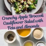 A fresh and crunchy Apple Broccoli Cauliflower Salad featuring bite-sized broccoli and cauliflower florets, diced apples, red onion, celery, green onions, dried cranberries, feta cheese, and roasted almonds, all tossed in a creamy lemon-honey dressing. Perfect as a healthy side dish or light lunch, this salad balances sweet, tangy, and savory flavors with a satisfying crunch.