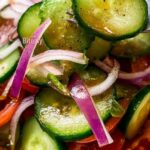 Layer the tomatoes, cucumbers, and onions on your favorite serving platter in an inviting pattern. Then drizzle the dressing evenly over the veggies to ensure every slice soaks in that tangy, savory goodness.
