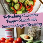 A refreshing and quick cucumber and pepper salad featuring a vibrant sesame ginger dressing, crisp mini cucumbers, sweet mini peppers, cherry tomatoes, and creamy avocado. This colorful dish is lightly seasoned with everything bagel seasoning and a touch of chili onion crunch for a perfect balance of flavors and textures, making it ideal for a light lunch or a healthy side.