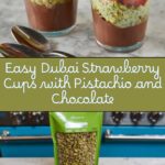 Dubai Strawberry Cups is a delightful layered dessert featuring toasted konafah dough mixed with creamy pistachio cream, fresh sliced strawberries, warm melted chocolate, and a sprinkling of chopped pistachios. This luscious treat combines a blend of textures and rich flavors inspired by Middle Eastern sweets, perfect for serving in clear cups to showcase its beautiful layers.