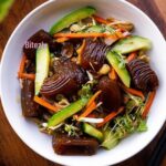 Grab your thinly sliced cucumbers, onions, julienned carrots, and shredded lettuce. Combine them gently with half of the sauce in a large bowl to allow the veggies to soak up some of that savory goodness without becoming overdressed. This layering builds fresh texture and flavor contrast.