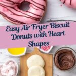 These delightful Air Fryer Biscuit Donuts are a quick and easy treat that combines the convenience of refrigerated biscuits with the fun of air frying. Shaped into charming hearts, then coated in luscious strawberry and chocolate frosting with sprinkles, they make a perfect sweet snack or dessert for any occasion.