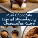 Let the cheesecakes cool to room temperature in their pan, then transfer to the fridge to chill for at least an hour. Once fully chilled, carefully unmold the mini cheesecakes by pushing up on the removable bottoms. Spoon the melted dark chocolate over each cheesecake, dip the strawberries in the same chocolate, and nestle them on top. Serve immediately to enjoy the contrast of creamy, crunchy, fresh, and chocolatey all in one bite.