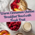 A warm and comforting Cinnamon Quinoa Breakfast Bowl featuring fluffy quinoa simmered in almond milk with cinnamon and vanilla, topped with toasted almonds, coconut flakes, fresh peaches, and raspberries. Sweetened naturally and optionally served with maple syrup, this breakfast is nutritious, gluten-free, and perfect for a cozy start to the day.