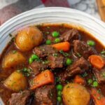 A hearty and comforting classic stovetop beef stew made with tender chunks of beef, aromatic herbs, vegetables, and a rich red wine-infused broth, slow-simmered to perfection for deep, satisfying flavors.