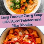 This Coconut Curry Soup with Sweet Potatoes, Carrots, and Rice Noodles Recipe has a broth-like consistency but with creamy richness from the coconut milk, making it perfect for sipping or spooning up with noodles.
