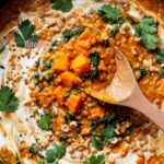 A hearty and flavorful Curried Red Lentil Soup featuring roasted sweet potatoes, aromatic spices, and creamy coconut milk. Perfectly balanced with vibrant spinach and a splash of lime juice, this comforting soup packs a nutritious punch and serves as an excellent plant-based meal.