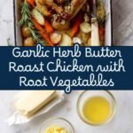 A flavorful Garlic Herb Butter Roast Chicken with tender roasted root vegetables including Yukon Gold potatoes, turnips, carrots, and shallots. The chicken is generously rubbed with a homemade garlic herb butter, roasted to juicy perfection, and served with crusty bread to soak up the rich buttery juices and roasted garlic cloves.
