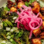 - Assemble Bowl: Spoon the creamy edamame avocado spread into bowls. Top with the finely diced cucumber, sliced scallions, and the baked, sticky tofu and broccoli mix. Garnish the bowl with pickled onions, black sesame seeds, and finish with a squeeze of fresh lime juice for brightness.
