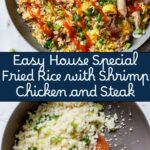 This House Special Fried Rice combines shrimp, chicken, and sirloin steak with savory seasonings and fresh vegetables, all stir-fried with cauliflower rice and brown rice for a flavorful and satisfying meal. Perfect for using leftover rice, this dish offers a delightful mix of textures and tastes, enhanced by ginger, garlic, and scallions, making it a delicious and quick dinner option.