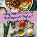 This Korean Ground Turkey recipe is a flavorful and healthy dish ready in just 30 minutes. It features lean ground turkey caramelized with a savory-sweet Korean-inspired sauce, served alongside fluffy white rice and a refreshing cucumber carrot salad. The combination of sesame oil, garlic, ginger, and chili garlic sauce delivers an authentic, spicy kick balanced by the crisp, tangy salad. Perfect for a quick weeknight dinner that packs bold taste and satisfying texture.