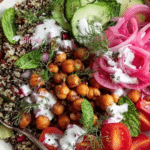 This vibrant Mediterranean Quinoa Bowl combines protein-packed quinoa, crispy smoky chickpeas, fresh veggies like cucumbers, cherry tomatoes, and creamy avocado. Enhanced with pickled red onions, fresh herbs, Aleppo pepper, and a flavorful garlic yogurt sauce, it makes a nutritious and delicious meal perfect for a healthy lunch or weeknight dinner.