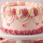 - Decorate: Use a large open star tip for dark pink (bottom border and embellishments), a small open star tip for pale pink, and a round tip for white frosting to pipe borders, swoops, and decorative accents along the edges, sides, and top as desired. Optionally, finish with edible glitter spray for extra sparkle.