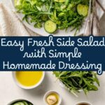 A fresh and simple side salad featuring crisp cos lettuce, refreshing continental cucumber, and peppery rocket, dressed with a tangy and slightly sweet vinaigrette made from olive oil, red wine vinegar, Dijon mustard, and maple syrup. Perfectly quick to prepare in just 10 minutes, this salad pairs well with a variety of dishes as a light, healthy accompaniment.
