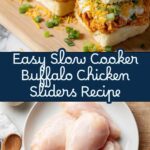 These Slow-Cooker Buffalo Chicken Sliders are a crowd-pleasing, easy-to-make recipe perfect for game day or casual gatherings. Tender chicken breasts are slow-cooked in butter, garlic, buffalo sauce, and ranch seasoning until juicy and flavorful, then shredded and served on soft slider buns with cheddar cheese, green onions, and your choice of ranch or blue cheese dressing for a spicy, creamy finish.