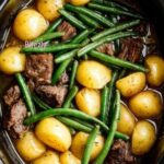 Tender slow cooker beef bites and baby potatoes cooked in a savory garlic butter sauce, complemented by fresh green beans. This easy one-pot meal is perfect for a comforting dinner with minimal effort, featuring rich flavors from onion soup mix, garlic, and butter.