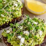 A quick and delicious recipe for smashed avocado on toasted sourdough bread, topped with tangy crumbled feta, everything bagel seasoning, and fresh pea sprouts. Perfect for a nutritious breakfast or light lunch.