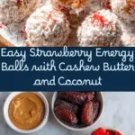 Delicious and nutritious Strawberries and Cream Energy Balls made with raw cashews, Medjool dates, cashew butter, and freeze-dried strawberries for a naturally sweet and creamy treat. These no-bake, easy-to-make energy balls are perfect for a quick snack or a healthy bite on the go.