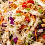 A vibrant and refreshing Thai Chicken Salad featuring a crunchy coleslaw mix, tender shredded chicken, fresh herbs, and a creamy peanut dressing with a perfect balance of tangy lime, sweet honey, and savory soy. This quick and easy salad is ideal for a light lunch or a flavorful side dish.